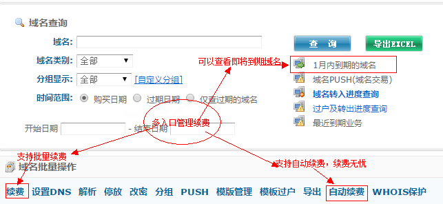 在域名管理界面中,选择【1个月内到期的域名】-可以查看近期不同时间到期的域名以续费;选择【域名批量操作-续费】或【域名批量操作-自动续费】可以批量对多个域名续费。