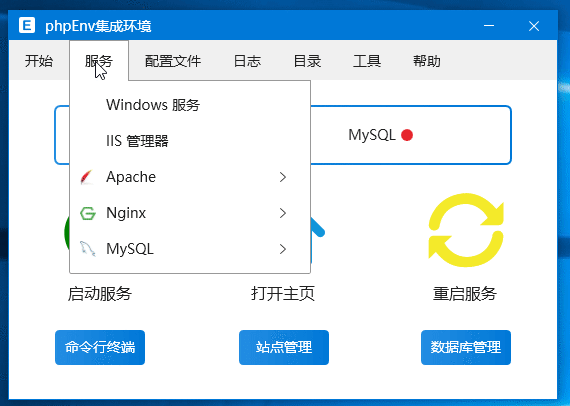 phpEnv是运行在Windows系统上的绿色的PHP集成环境,集成了Apache、Nginx等Web组件。支持不同PHP版本共存,支持自定义PHP版本,自定义MySQL版本。主打开发环境,也可以用作服务器环境。拥有清除PHP环境阻碍、解除端口占用、支持切换MySQL、强制修改MySQL密码,兼容其他集成环境,内置Redis、Composer和功能强大的命令行、本地Tcp端口进程列表等实用功能。