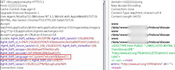 我们来看下刚才产生漏洞的代码,在第535行往下看,有一段代码是这样写的,默认网站系统将缓存数据存储在data文件夹里的template目录中,缓存文件名的命名是由前面的discuz_lang参数进行控制来命令的,漏洞产生的原因就在这里。那这个discuz_lang参数的值是从来获取来的呢? 我们跟进分析网站代码,可以看到是从language语言这一变量里去获取的值,也就是说,我们要利用这个网站漏洞,首先要去改变这个language的值,将恶意代码插入到这个值当中去,POC代码如下: