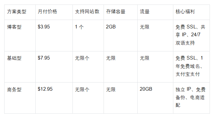 适用场景:个人博客、入门级网站、预算有限的小型跨境站点;