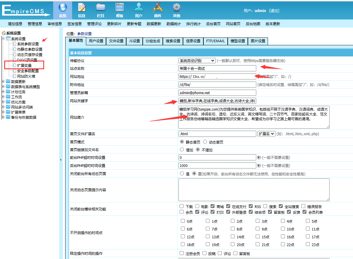 首先进入系统参数设置,修改为你的网址以及其他参数,然后点进去拓展变量!修改为你的数据!