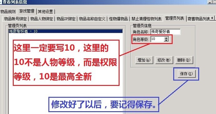 点击管理员列表,输入你在游戏中的人物名称,权限修改为10,10是最高等级的权限了,点击增加然后保存就可以了,个别引擎需要小退才能显示