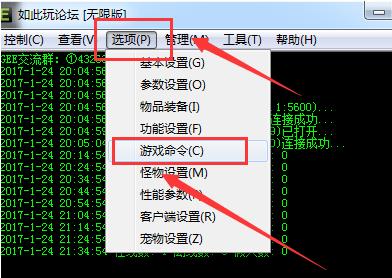 查看刷装备的命令方法,还是在M2server中,点击选项,游戏命令,