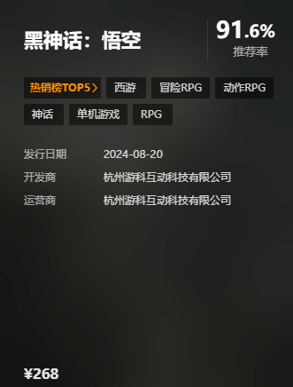 《黑神话:悟空》,一款由游戏科学开发的西游题材单机·动作·角色扮演游戏,已于2024年8月20日全球发售。