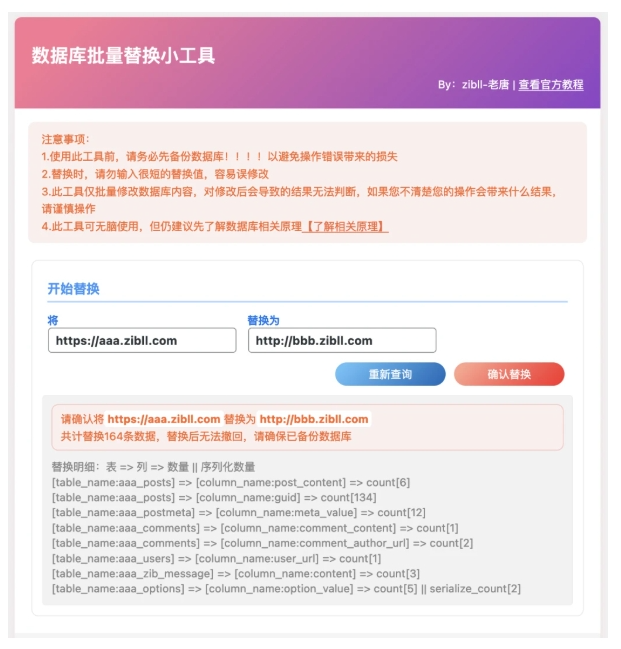 以上示例,仅仅是一些常用的场景,实际上这个工具的核心就是数据库内容批量替换,但是既然涉及到数据库,那么使用此插件,请务必阅读并熟知以下注意事项: