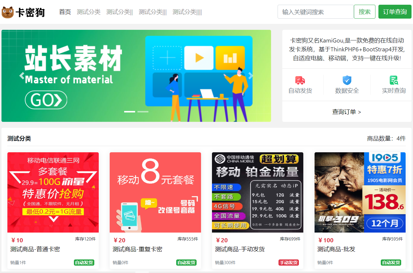 卡密狗又名KamiGou,是一款优雅、免费的在线自动发卡系统,基于ThinkPHP6+BootStrap4开发,自适应电脑、移动端,支持一键在线升级!